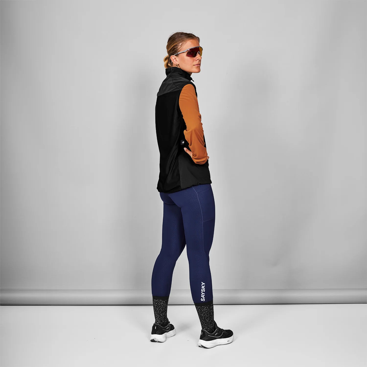 Die schwarze Saysky Clean Pace Flex Laufweste Unisex bietet beim Laufen ausgezeichneten Windschutz und überzeugt mit einem atmungsaktiven Stretch-Rücken. Ideal zum Tragen im Schichtenprinzip.